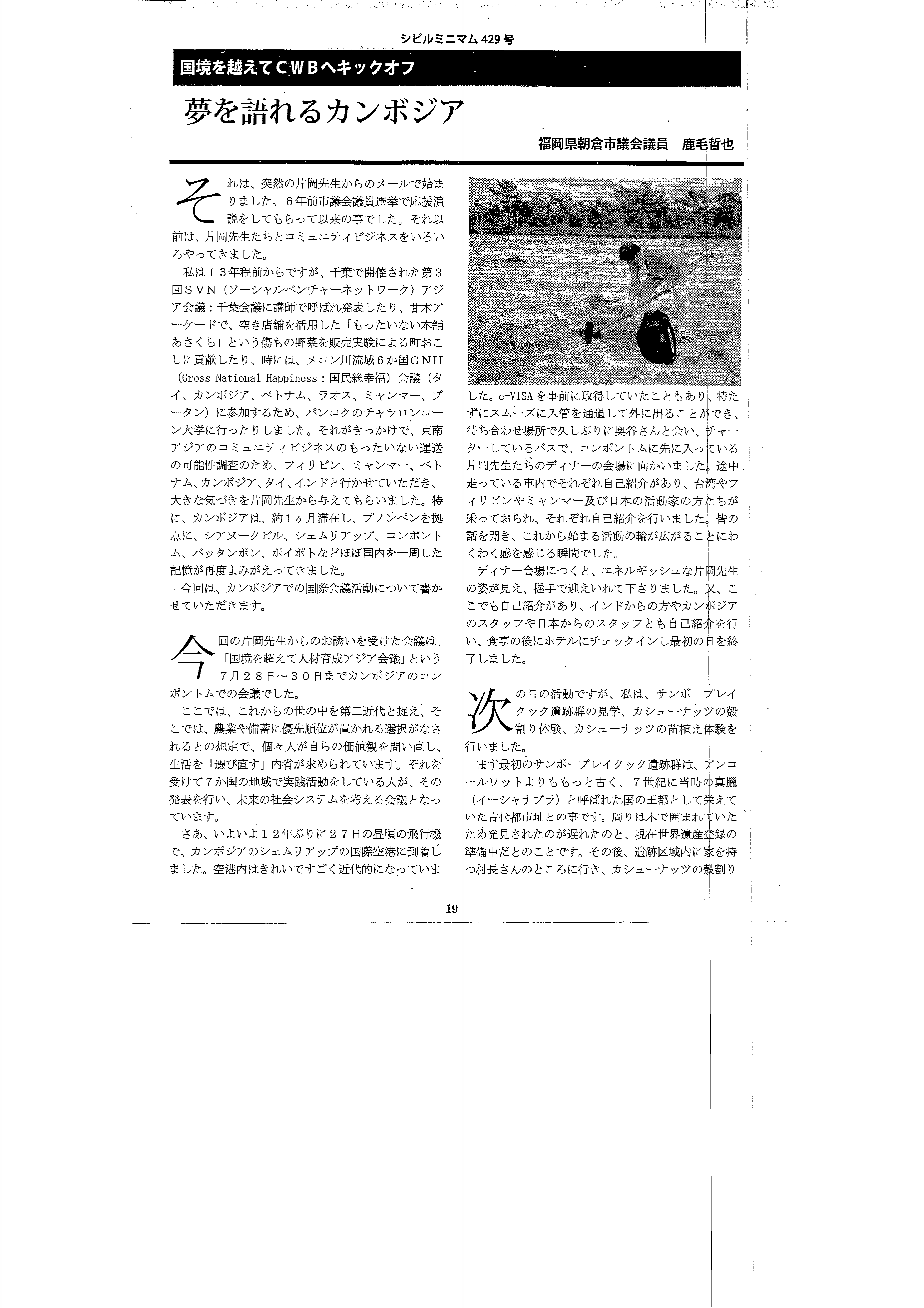 それは、突然の片岡先生からのメールで始まりました。6年前市議会議員選挙で応援演説をしてもらって以来の事でした。それ以前は、片岡先生たちとコミュニティビジネスをいろいろやってきました。私は13年程前からですが、千葉で開催された第3回SVN(ソーシャルベンチャーネットワーク)アジア会議:千葉会議に講師で呼ばれ発表したり、甘木アーケードで、空き店舗を活用した「もったいない本舗あさくら」という傷もの野菜を販売実験による町おこしに貢献したり、時には、メコン川流域6か国GNH会議(タイ、カンボジア、ベトナム、ラオス、ミャンマー、ブータン)に参加するためバンコクのチャラロンコーン大学に行ったりしました。それがきっかけで、東南アジアのコミュニティビジネスのもったいない運送の可能性調査のため、フィリピン、ミャンマー、ベトナム、カンボジア、タイ、インドと行かせていただき大きな気づきを片岡先生から与えてもらいました。特に、カンボジアは、約1ヶ月滞在し、プノンペンを拠点に、シアヌークビル、シェムリアップ、コンポントム、バッタンバン、ポイポトなどほぼ国内を一周した記憶が再度よみがえってきました。今回は、カンボジアでの国際会議活動について書かせていただきます。