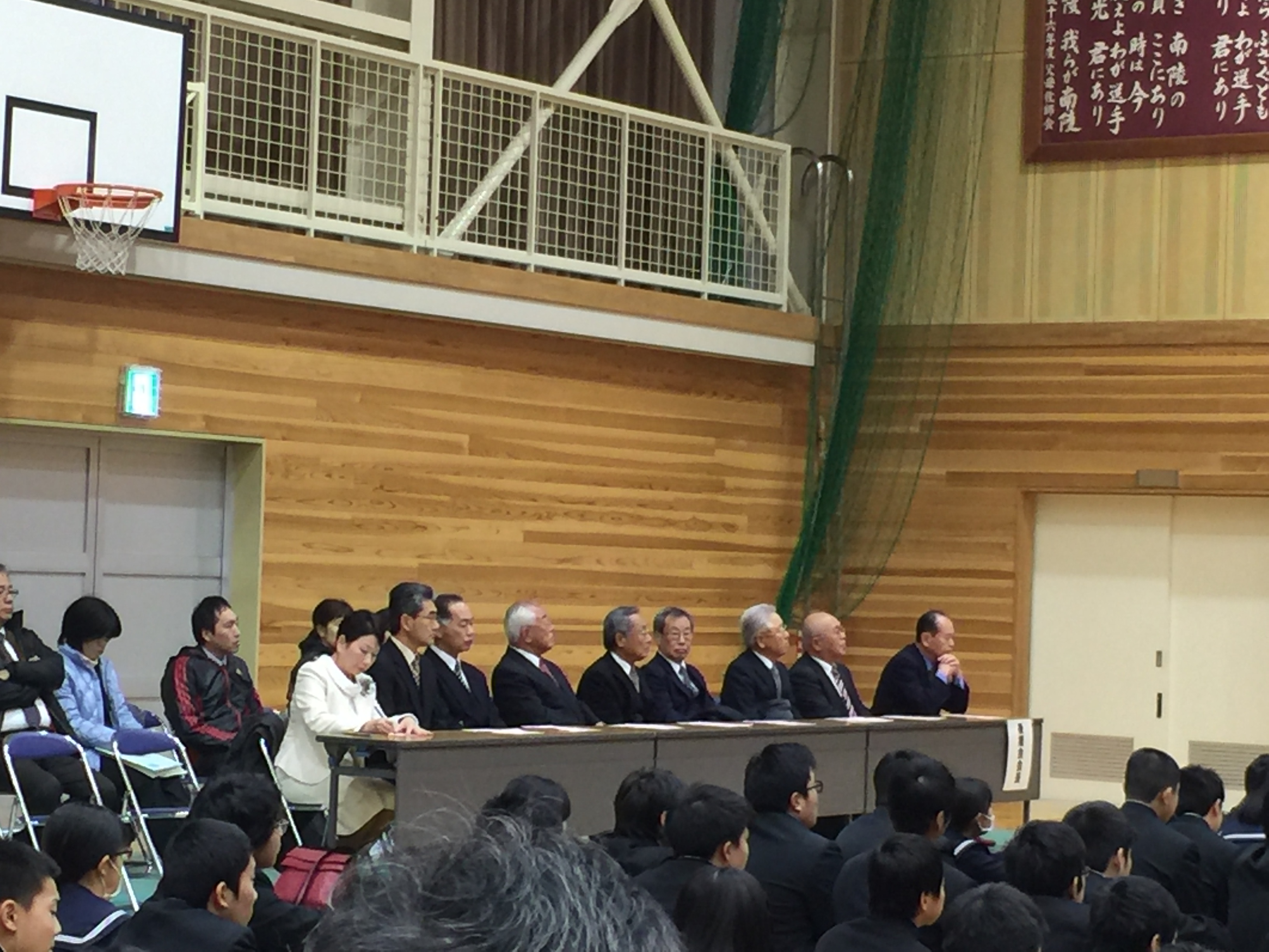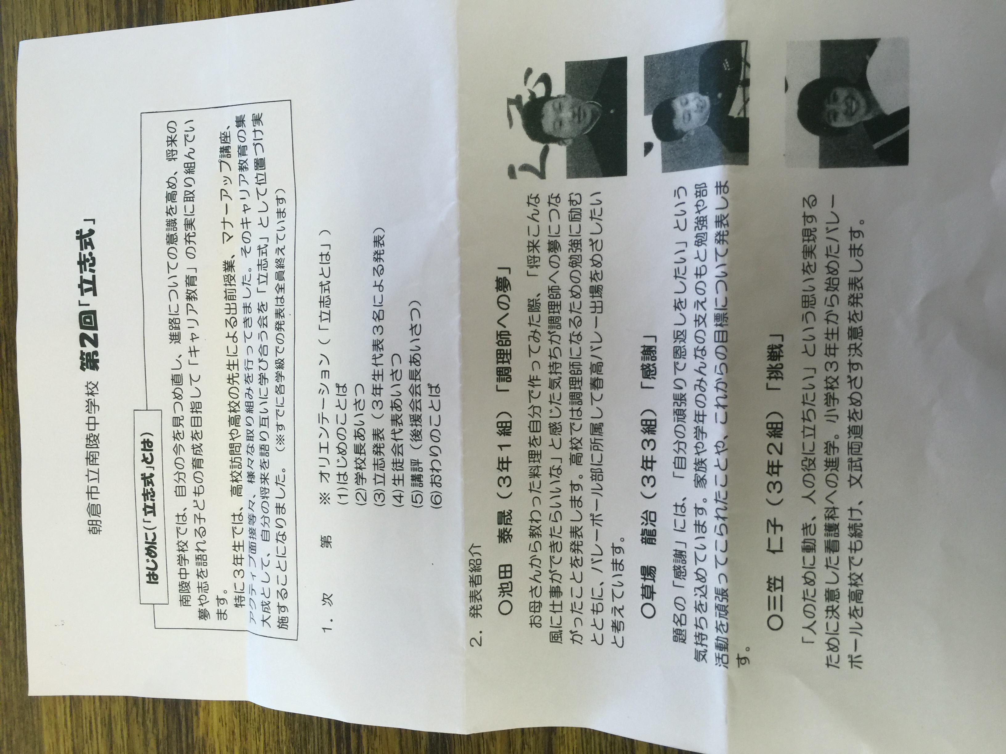 表題の式典が、校長先生の挨拶の後始まりした。本年度は3人の生徒が発表をしました。ひとりひとりの将来の目標や日ごろの皆さんに対する感謝の言葉。将来の夢や、クラブや勉強の具合などを事細かに発表していました。少年よ大志をいだけ。クラーク博士の言葉を思い出しました。