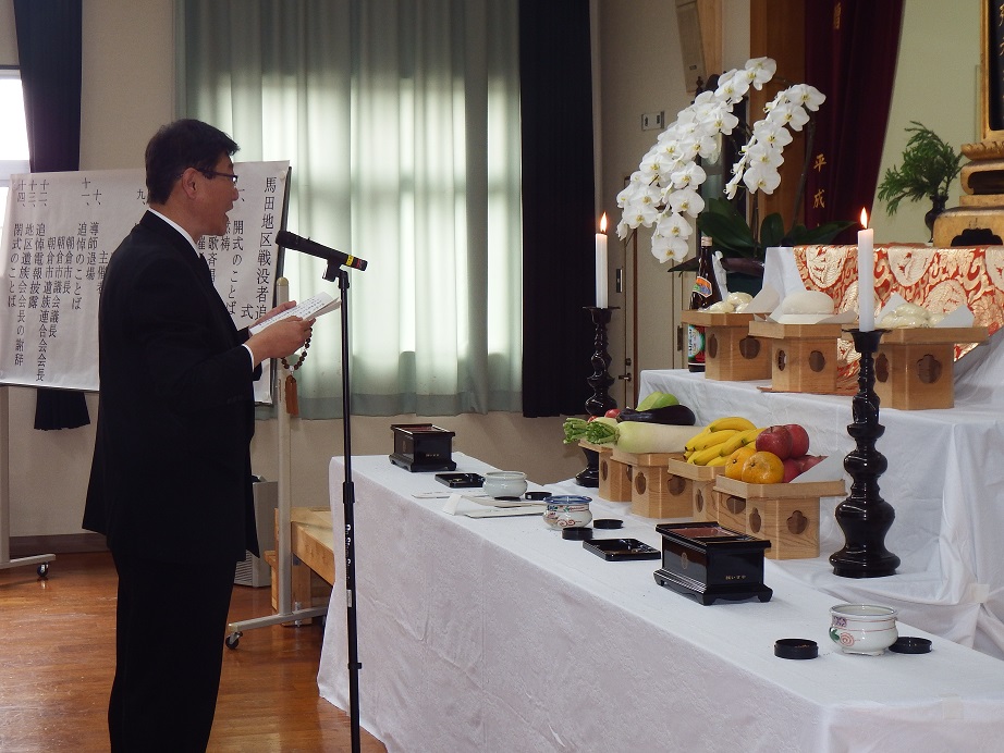 表題の追悼式が、馬田コミュニティセンター講堂で、粛々と開催されました。主催者である草場会長の挨拶のあと順次焼香等が行われました。