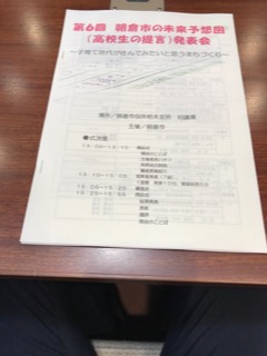 表題の発表会に参加しました。朝倉市内の三つの学校と朝倉市在住の明善高校の生徒たちが、それぞれに発表を行いました。私が特に興味を持ったのは、朝倉離乳食プロジェクトです。そういえば市内の食堂で離乳食を出す食堂はないなぁと思いながら非常に関心をしたところです。発表した皆さんこれからも朝倉市のために一生懸命考えて住みやすい市になるように助言してください。準備や企画をされた職員の皆さん本当ににお疲れ様でした。