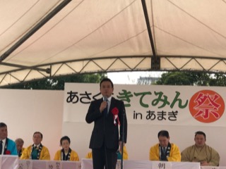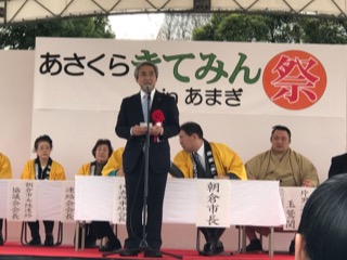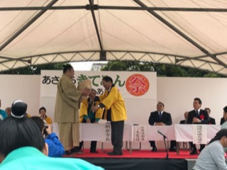 表題のお祭りが、JA筑前朝倉本店駐車場で行われています。私は来賓として開会式に参加をしました。地域の特産品や姉妹都市高鍋から来ていただき物産展が開催されています。みかんの袋詰め500円はおトクです。片男波部屋の力士たちも参加をして盛大に行われています。もちろん今場所好調の玉鷲関も参加していました。
