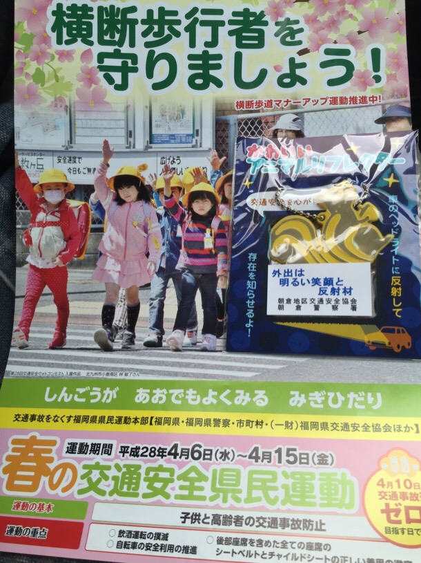 表題の県民運動が今日から始まり、朝倉市立石の甘木消防署付近の交差点で、それぞれの地域に分かれチラシや記念グッズの配布を行いました。今回も、子供たちにも参加をいただきチラシやグッズの配布の手伝いをしていただきました。最後に市長より子供たちへ記念品贈呈が行われ解散いたしました。運動の重点は、飲酒運転の撲滅、自転車の安全利用の推進、後部座席を含めた全ての座席のシートベルトとチャイルドシートの正しい着用の徹底、となっています。この運動で事故が少しでも減ることを願っています。早朝より参加された皆様大変お疲れ様でした。