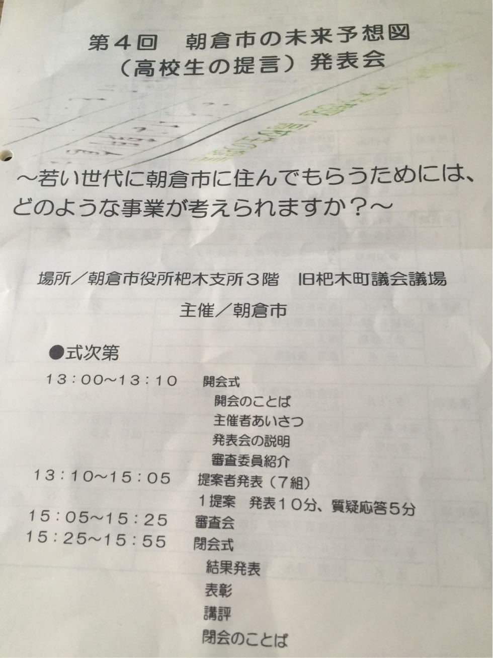 標題の発表会が、朝倉市役所杷木支所3階旧杷木町議会議場において開催されました。46件の応募の中から今回は、7件の発表が行われました。今回は、若い世代に朝倉市に住んでもらうためには、どのような事業が考えられますか?がテーマとして与えられました。優勝したのは朝倉東高等学校3年、グループわれら東高生でタイトルは、朝倉市の未来のために〜僕たちにできること~が見事1位に輝きました。このチームの発表は、非常にユニークでウラル甘草を使って漢方薬を作っている会社を誘致するテーマでした。実際に岩国市まで視察に行っていろいろ調査をしてきているのも行動力がありました。ぜひこの企画が実現するように私も応援したいと思います。発表者のみなさんそれから市の担当者の皆さん大変お疲れ様でした。