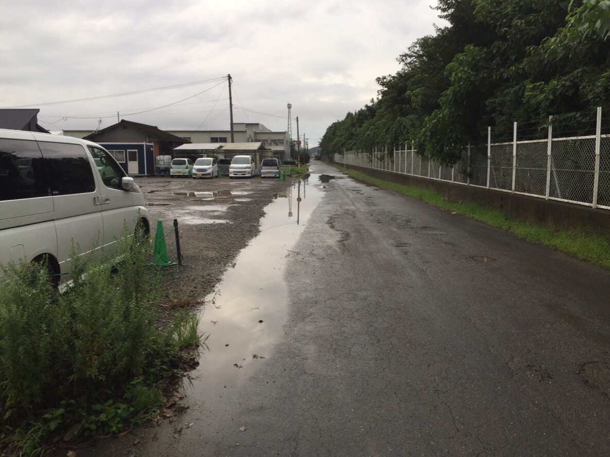この日は朝から雨が降っていて相当な量の雨量があったと推測されます。中原の区会長様より連絡があり夕方現地調査にお伺いいたしました。土砂が市道に流出し雨水も道路にたまっている状態でした。早急に解決策を探るべく市のほうに連絡をし調査をするよう指示をしたところです。