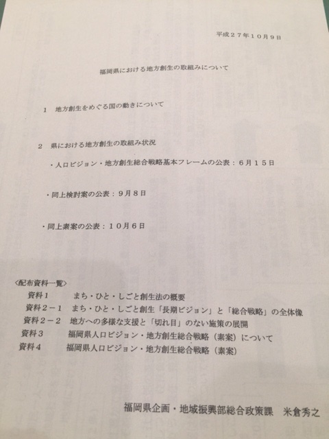 表題の研修会が、初めて開催されました。今回の講師は、福岡県 総合政策課 米倉課長をお迎えして、福岡県における地方創生の取り組みについてわかりやすく説明をうけ、人口減少時代に待ったなしの危機感を覚えました。参加者は、市郡市議会議員、林県議、原田代議士奥様、市町村職員等が講演を聞きに来ていました。懇親会では市郡の首長や栗原県議も参加されさらに懇親を深めることができました。またこの研修会は、これからも続けていく事になりました。