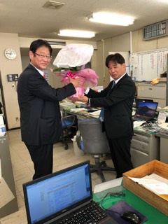 お世話になっている、安部局長が退職されますので、建設経済常任委員会から、蘭の花を代表して贈呈致しました。長い間お勤めご苦労様でした。辞められても朝倉市をよろしくお願い致します。