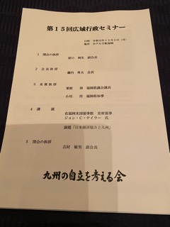 九州の自立を考える会主催で、表題のセミナーが福岡市のホテル日航でそうそうたるメンバーの参加のもと盛大に開催されました。蔵内会長挨拶や栗原議長、県知事などが挨拶され在福岡米国領事館主席領事 ジョン・C・テイラー氏の後援が有り大変有意義なセミナーでした。