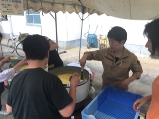 表題の件で杷木中に入りました。やはり食べものが偏りすぎているからと、市内の某会社の人が一品温かいトウモロコシのスープを差し入れしているのを同行させていただきました。筑前町のビストロリュバンのマスターが味付けをしていただきました。避難者の方も弁当に温かいスープに舌鼓をうって飲んでおられました。