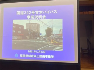 表題の事業説明会が馬田コミュニティティセンター講堂において県土整備事務所の主催で朝倉市も参加のもと関係者の説明会が開催されました。主に東田交差点から千代丸のローソンまでの道路の拡幅計画についてが今回の議題でした。これからそれぞれ現地調査測量に入りその後用地交渉に入っていきたいとの事でした。また、栗原議長も来られ協力要請等々がありました。地域の道路インフラが整備されていく事は非常に良いことだと思います。早期の事業開始を望んでおります。参加された皆様大変お疲れ様でした。