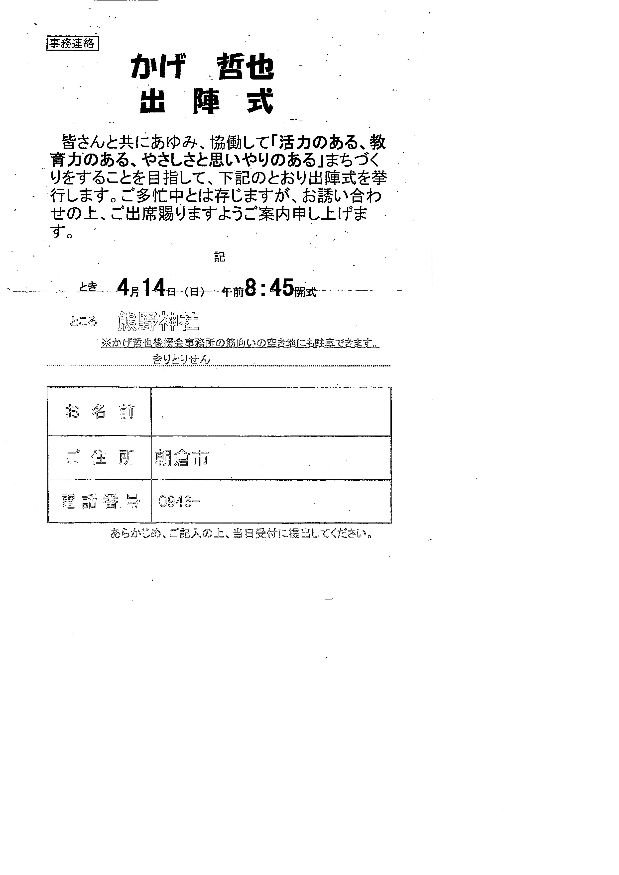4/12 かげ哲也後援会入会案内及び出陣式(4/14 am8:45~)案内
