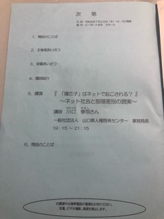 ネット社会と部落差別の現実と言う内容で、一般社団法人山口県人権啓発センター事務局長である川口泰司さんの講演がありました。最近のネットでの差別の現状を聞き、色々と考えさせられる内容でした。参加した皆様お疲れ様でした。