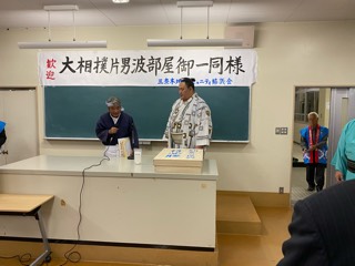 表題の歓迎会が朝倉農業高校跡地で、三奈木コミュニティ主催のもと盛大に開催されました。玉鷲関の力強い勝利に向けての誓いの言葉に会場が大変盛り上がりました。玉鷲関ガンバレ